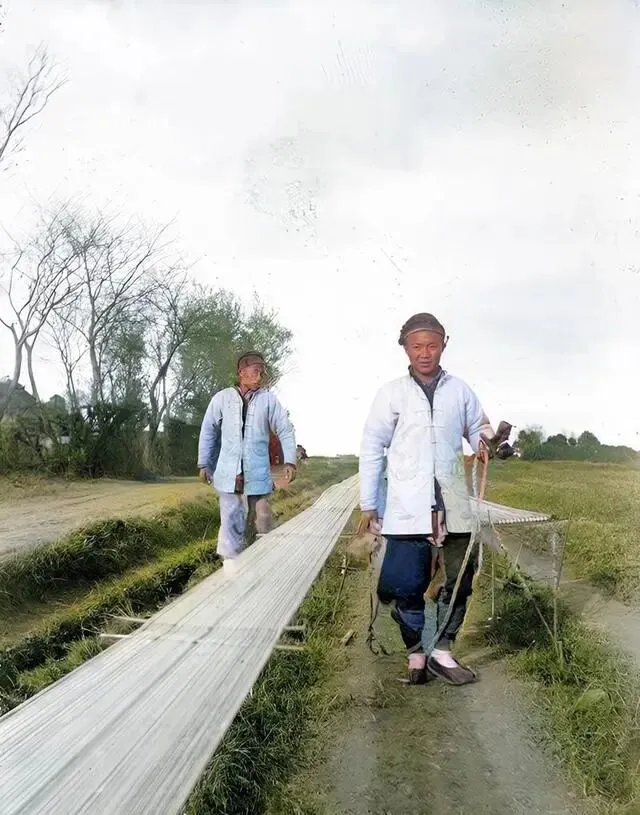 这两位工匠正在专心致志地制作棉纱,每一根棉纱都被拉扯得笔直笔直。这是一种高超的手艺,需要精湛的技术,从他们的自信眼神中可以看出,他们对自己的制作成果非常满意。