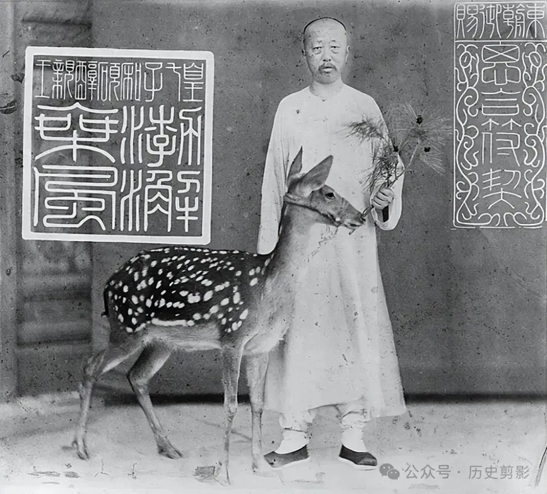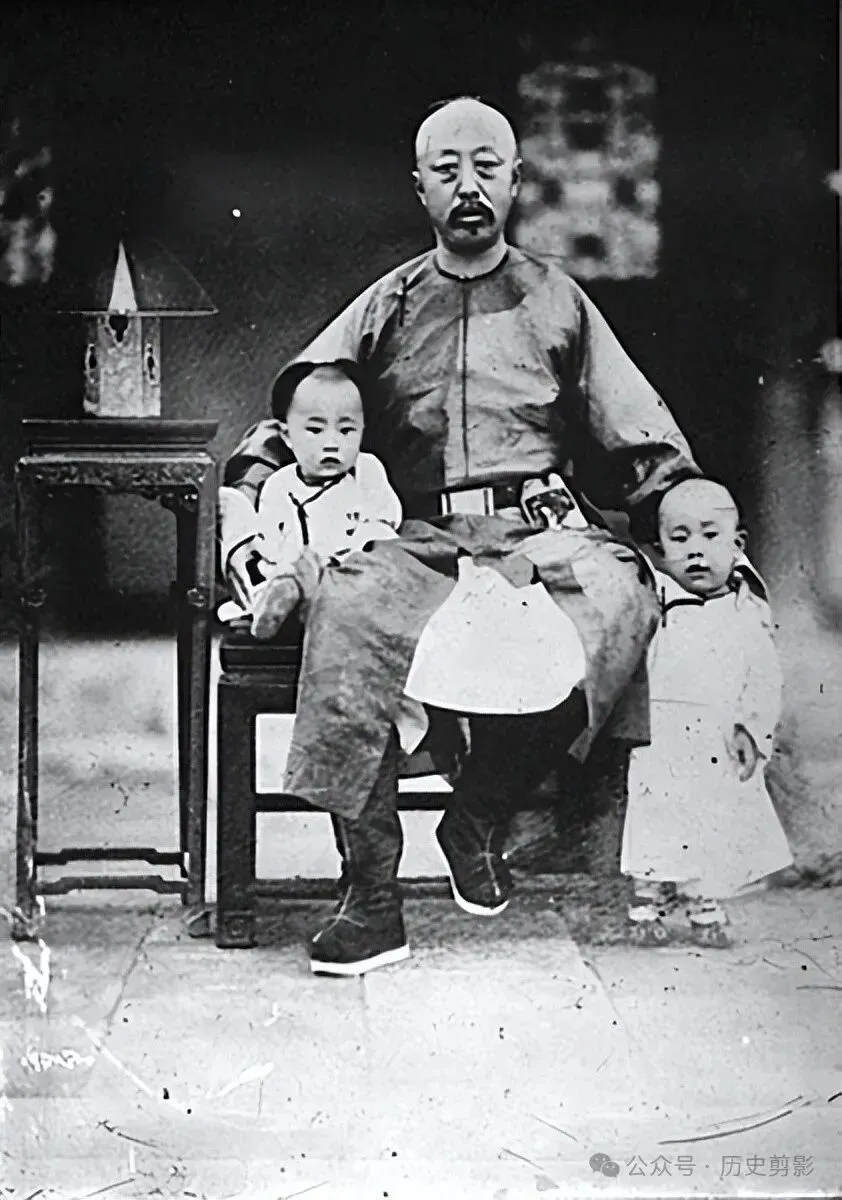 爱新觉罗·奕譞,号朴庵,是道光帝第七子,生于道光二十年九月二十一日(1840年10月16日),道光三十年(1850)咸丰帝登基后封为醇郡王。咸丰十一年(1861)“辛酉政变”时,与恭亲王奕欣一起为两宫太后垂帘听政出力,事后奕欣封为议政王,主管枢垣、总署,奕误则任御前大臣、领侍卫内大臣等职,主管神机营练兵事务。同治十一年(1872)晋封亲王,十三年末因次子载湉入承大统为光绪帝,疏请开去一切差使,懿旨允之,命以亲王世袭罔替。光绪六年(1880),中俄伊犁交涉事起,时局紧张,受命复出,参与议政,再管神机营。十年(1884)三月,中法越南事急,北宁、太原失守,主持全局的恭王不能有效应对危机,慈禧太后与醇王定议,免去恭王本兼各职,军机处全班易人;醇王以皇帝生父关系,不便公开主持大政,懿旨命中枢、总署遇有大事与之商议,光绪十六年十一月二十一日?(1891年1月1日)因病去世。儿时的光绪与生父醇亲王奕譞的合影(也有人质疑站立着不是光绪,谓其不合满清君臣之礼。)