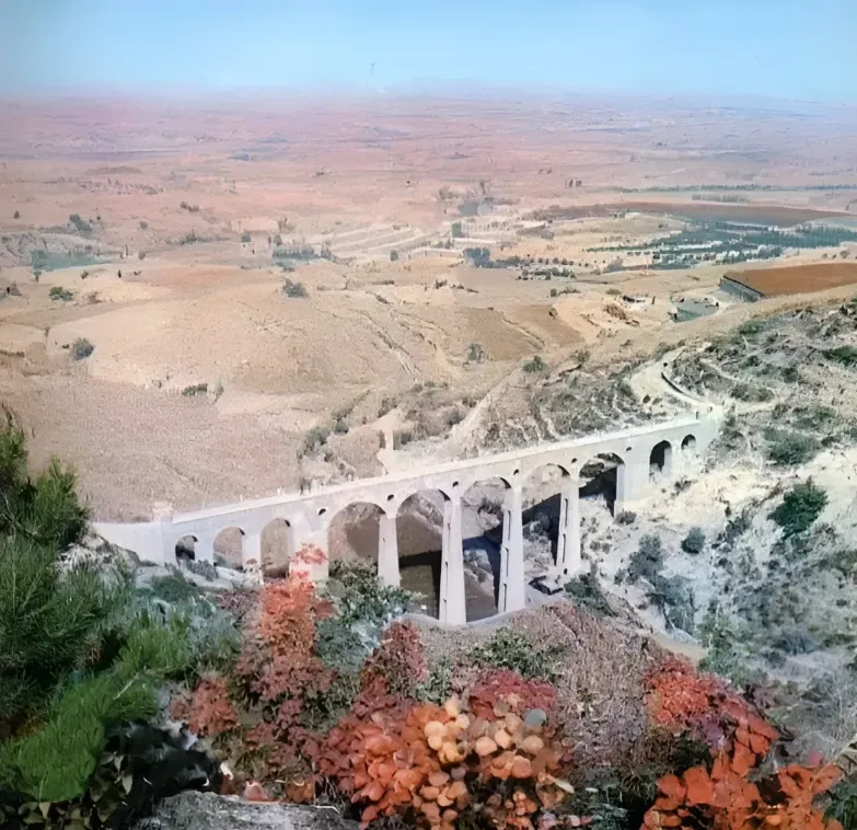你看这张照片,是从团结沟渡槽引水到虎头山的,是灌溉大寨的梯田的。一些社员们是正在玉米地里浇水的,