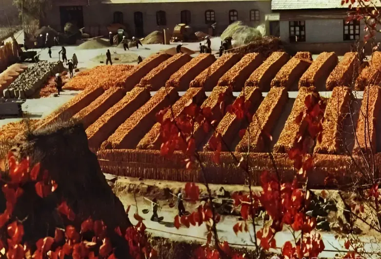 你看这张照片,是在晒谷场上,玉米穗是整齐地码放着的。社员们是正在打谷和晒粮的,是一派繁忙的景象,