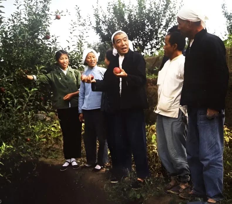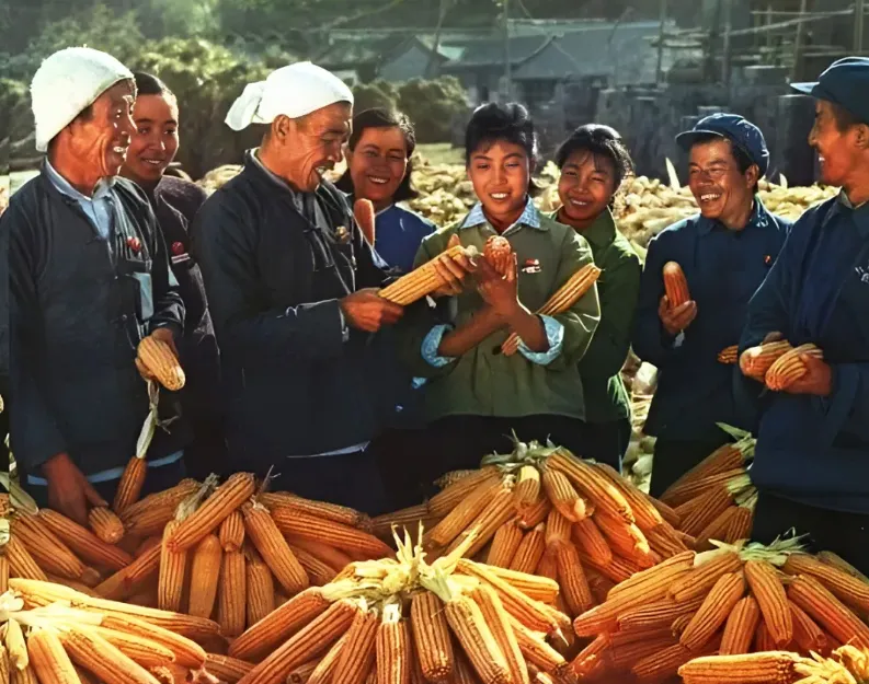 你看这张照片,是玉米获得了丰收,时任大寨村前党支部书记的陈永贵,是正与社员们查看农业成果的,