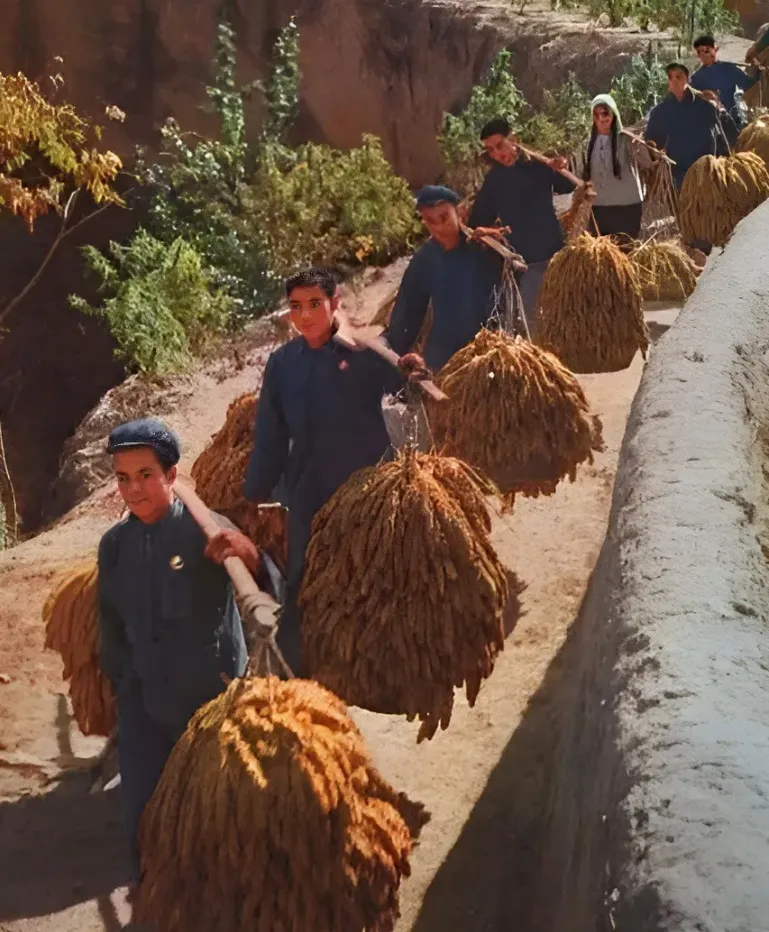 你看这张照片,是秋收季节,大寨谷子熟了,社员们是用扁担将谷穗挑下山的,是在山下的打谷场上脱粒的,