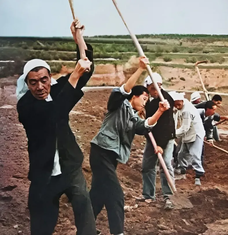 你看这群女社员,是从远处挑来土,是一筐筐填在石坝里的,最终是变成了肥沃的田地的,