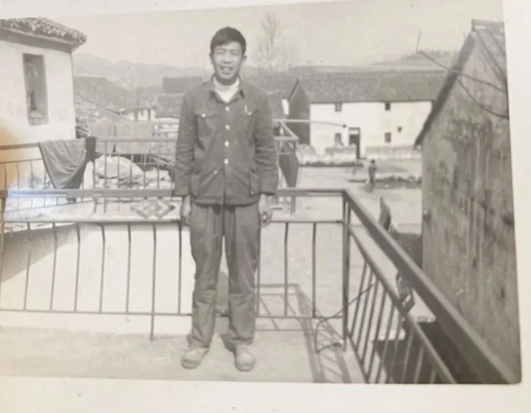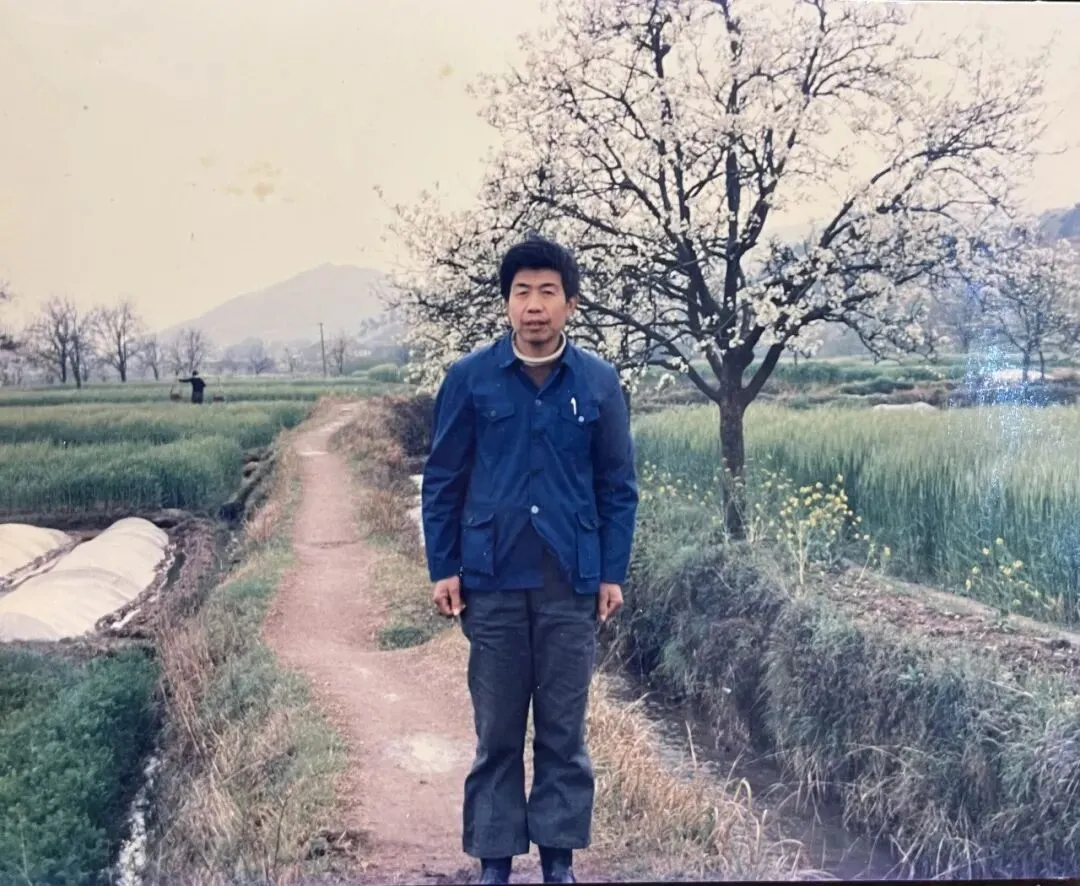 第二张彩色照片中,人物身着蓝色工装外套站在在田埂上,脚下是邢宅村前的唯一的“大路”,仅有一米多宽,四周的梨树开着雪似的白花(邢宅村那时也叫梨花村),旁边是绿油油的农田,田畈里的青苗嫩得能掐出水来。远处的龙祈山轮廓柔和,像邢宅村永远的背景板,是典型的乡村春日景致。那时候的邢宅村,日子裹着泥土与花香,虽然生活条件比较艰苦,但村民们一步一步踩在田埂上,每一步都是踏实的声响。