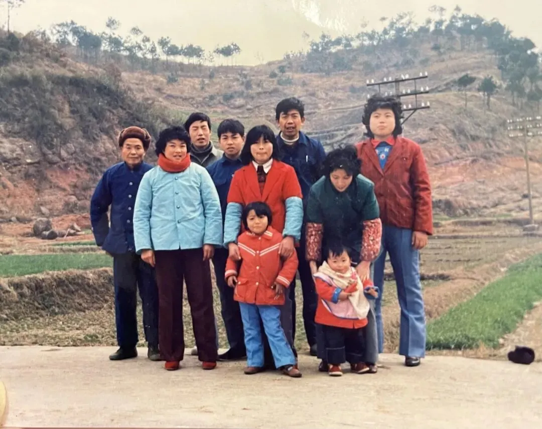 第三张彩色全家福的画面里,两个家族的人站在邢宅村黄牛畈田垄边,穿着色彩鲜艳的外套,红的袄、蓝的衫,色彩在乡土间撞出鲜活的暖意。孩童的红色套装与成人的复古穿搭相映,背景是邢宅村丘陵地貌的农田与山坡,既展现了家庭团聚的温馨,也体现出八九十年代乡村家庭合影的审美与场景偏好。选择户外自然或乡村地标作为背景,着装偏向当时流行的亮色与实用款。这是邢宅村最动人的模样,家人闲坐,灯火可亲,哪怕只是站在田埂上的合影,也裹着化不开的亲情。