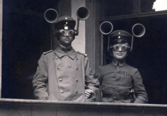 图一,图为一战德军,这是两名战地观察员,他们负责观察敌军动向,监听敌军的动静,他们最好的伙伴就是头顶上的监听器,一边连着耳朵当作收音器,一边连着眼睛当作潜望镜,一举两得,只是看起来有点像蜗牛。