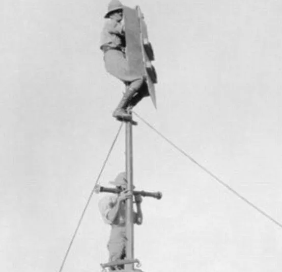 图四,图为一战期间的杆梯,不过和杆梯不同的地方在于它有两个轮子能够随时移动,这种设计是为了方便电话线的铺设。