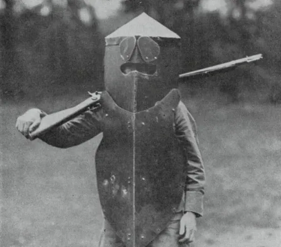 图五,图为一战期间的“龟壳兵”,这种笨重的盔甲对子弹的防护性能咱们姑且不论,背着这么一身盔甲,士兵该如何进攻才是最大的问题。