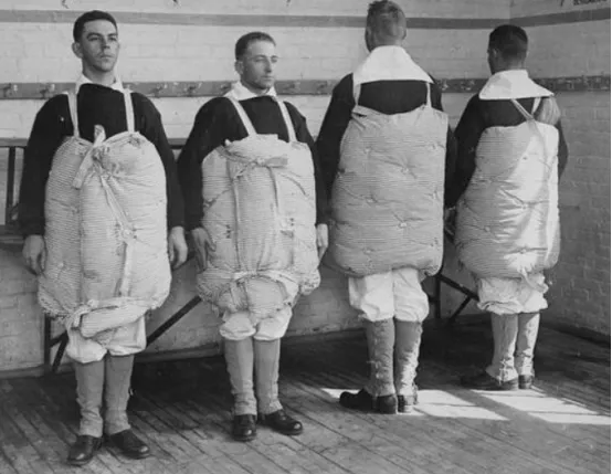 图六,大家一定想不到,这是一百年前的美军,一战期间,由于海军装备不足,美国海军官兵只好将被子褥子当做救生衣绑在身上。