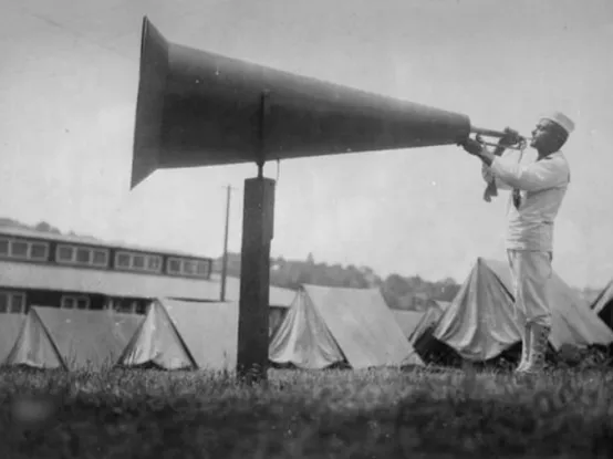 图七,图为一战美军,在训练营地时,他们每天都会被这种大喇叭“吵醒”,不过笔者更同情吹号的老哥,如果被震聋了应该算工伤吧。