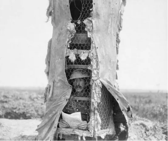 图八,说来大家可能不信,这玩意是狙击手的伪装,上面是观察员,下面是狙击手,他们伪装的是一棵大树,看到这,笔者真是想说“战场不需要视力”。