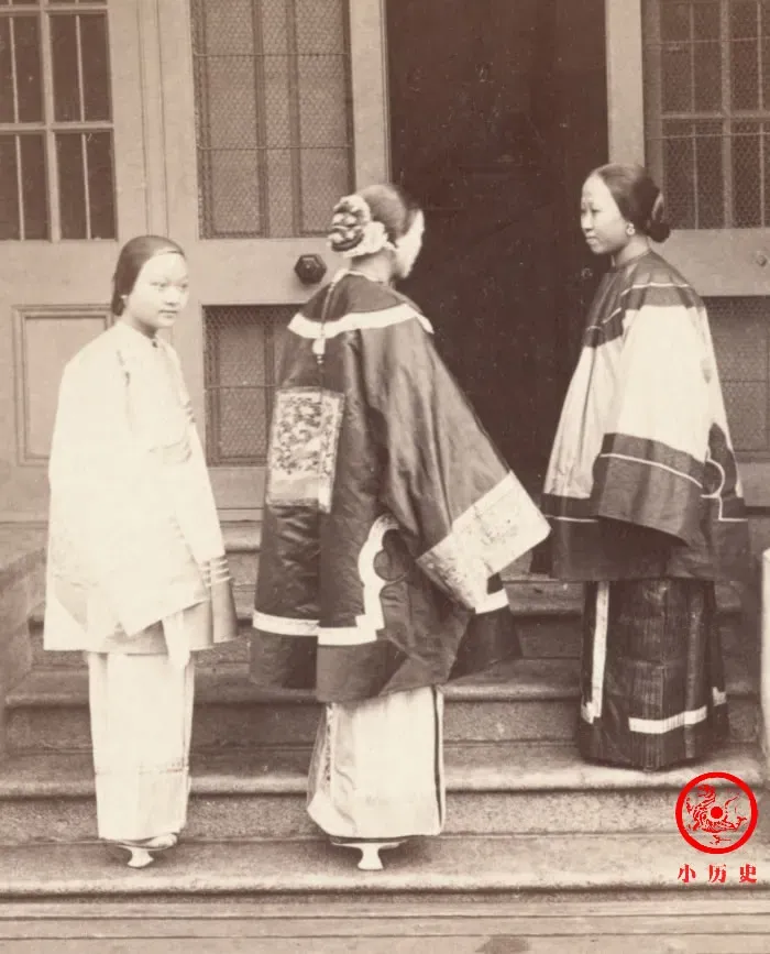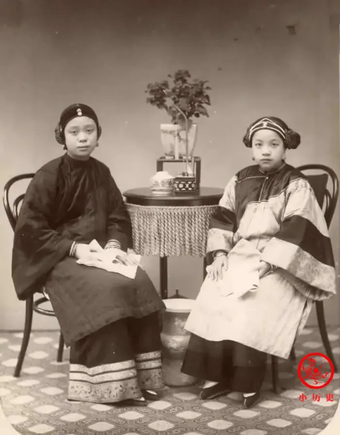 两位女子面容姣好,衣饰讲究,从头到脚的装束都是典型的晚清风格。为迎合当时的审美,她们特意从宽大的裤腿里露出“三寸金莲”。