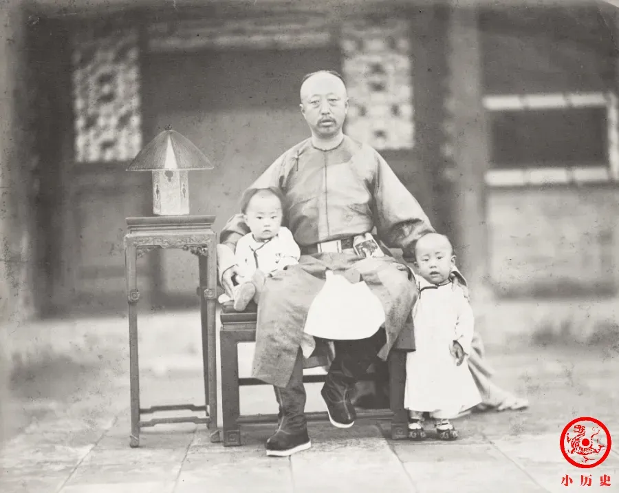 奕譞一生与妻妾共生育7个儿子。长子、三子、四子夭折,二子载湉4岁时入宫称帝,只有五子载沣、六子载洵(照片中的两个孩子)依偎在他身边。拍照时最小的儿子载涛尚未出生。这张照片颇有一种父慈子孝的氛围。
