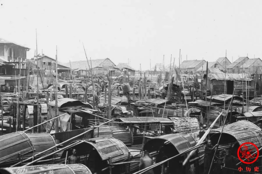 在没有汽车和道路建设落后的情况下,小船是便捷的出行工具。这张照片展示了晚清广州河道上小船拥挤不堪的震撼场面。其实,小船不仅是交通工具,还是很多穷人的家。