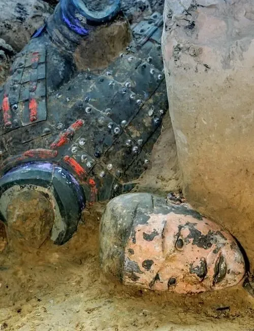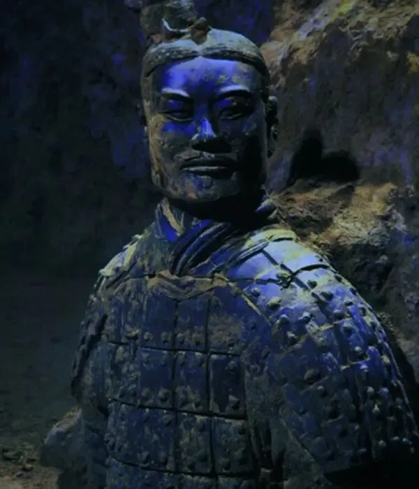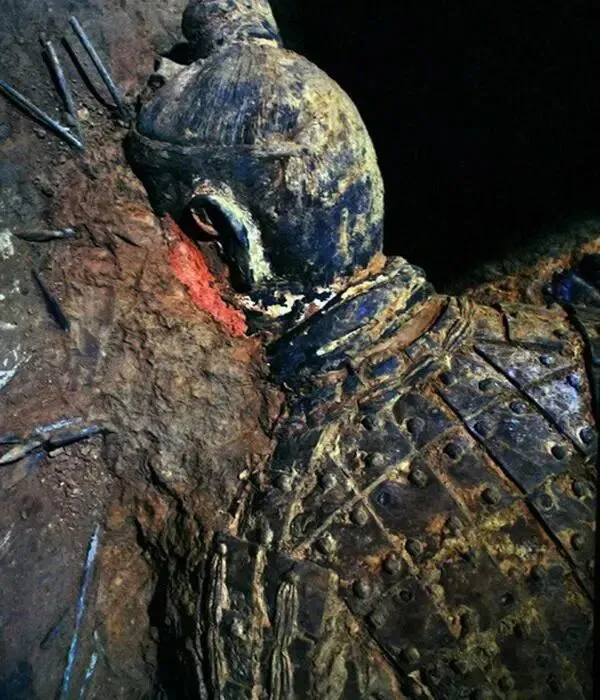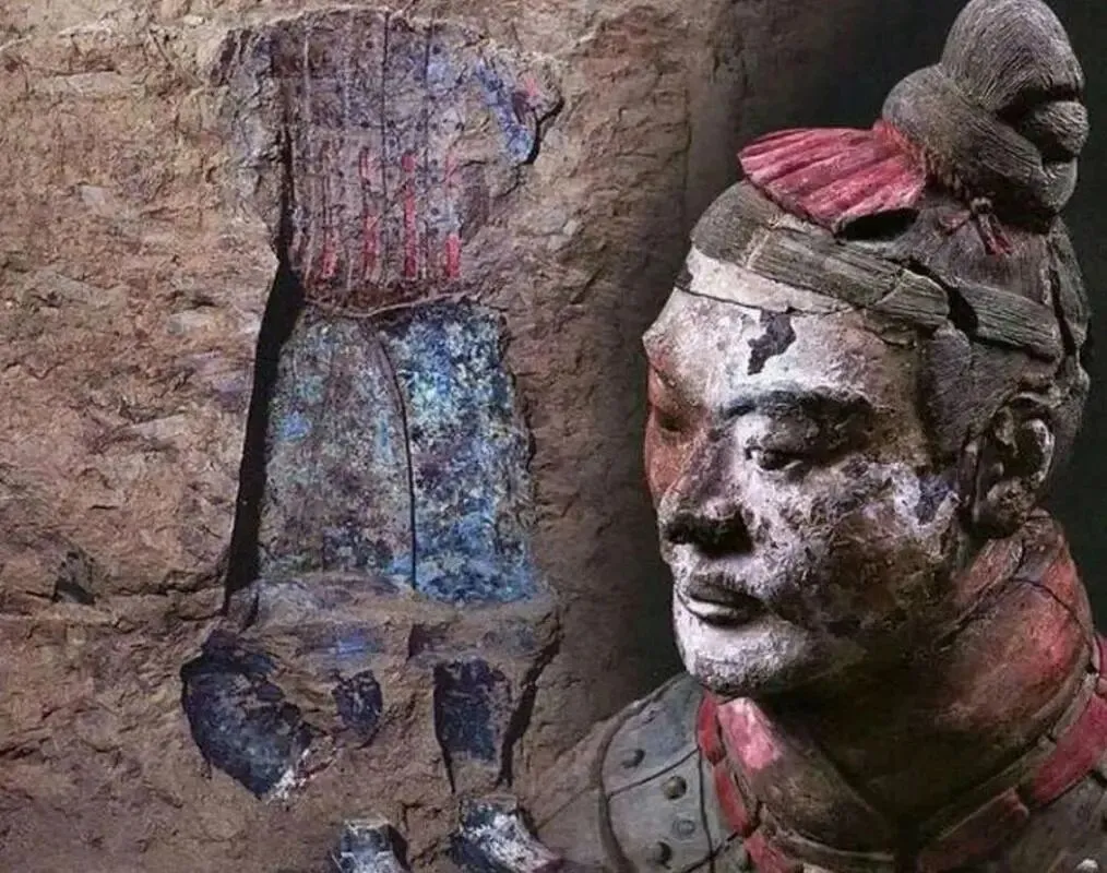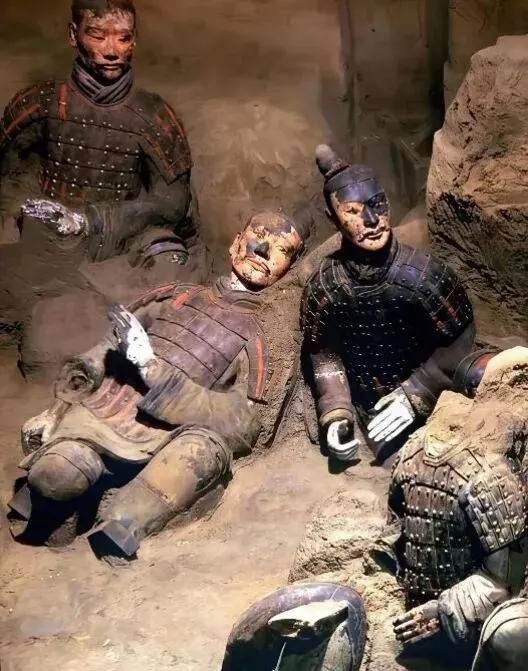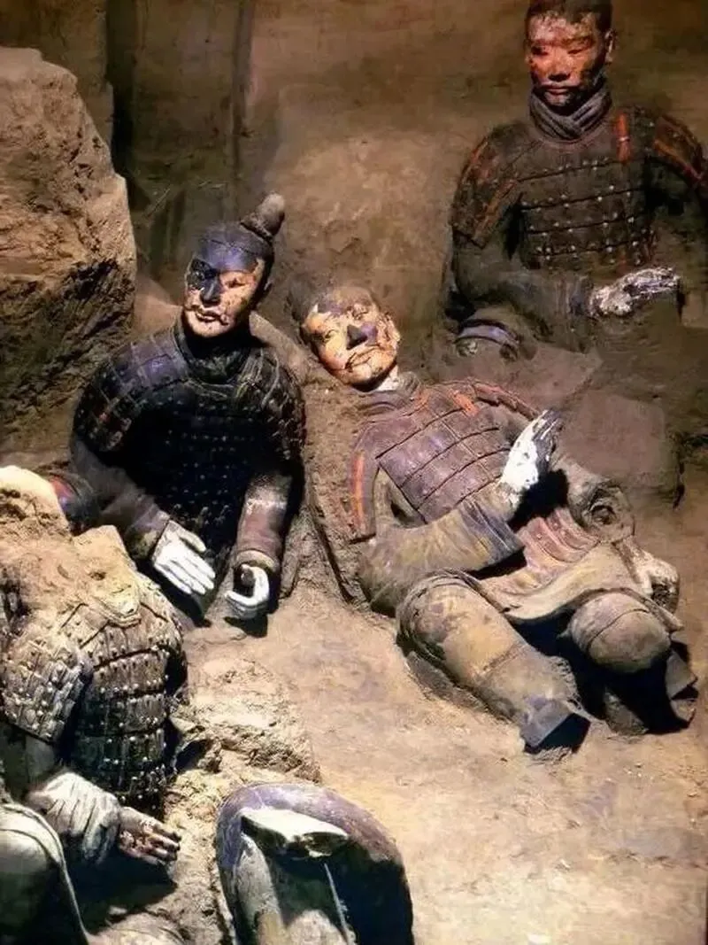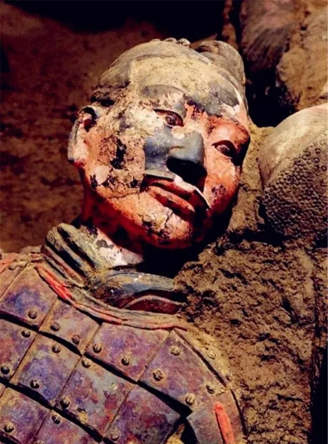 这是1974年秦始皇兵马俑刚刚出土时的样子,这些陶俑造型各异,身披铠甲,细节丰富,有鲜艳的彩绘。但绝大多数在出土后几分钟内因氧化迅速褪色,仅少数深埋俑保留部分色彩痕迹。兵马俑原来的颜色丰富多样,有朱红、粉红、粉绿、粉蓝、紫色、天蓝、黑、白、赭等十几种。其中,粉绿、朱红、紫色、天蓝数量较多,比如士兵的铠甲有朱红、粉绿等色彩,面部有粉红的肤色,服饰还有紫色、天蓝等装饰色。