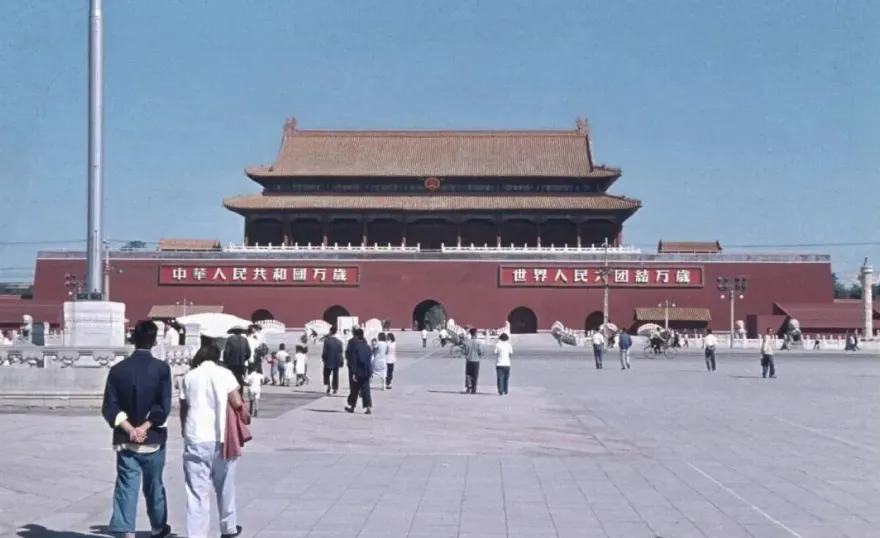 图1:天安门广场的老照片,蓝天背景下,天安门城楼红墙黄瓦,标语是 “中华人民共和国万岁”“世界人民大团结万岁”,广场上的人们穿着朴素的中山装、工装,步伐从容,有的三两结伴,有的独自漫步,灰色的广场砖整洁开阔,没有如今的拥挤,透着那个年代特有的平和与庄重。