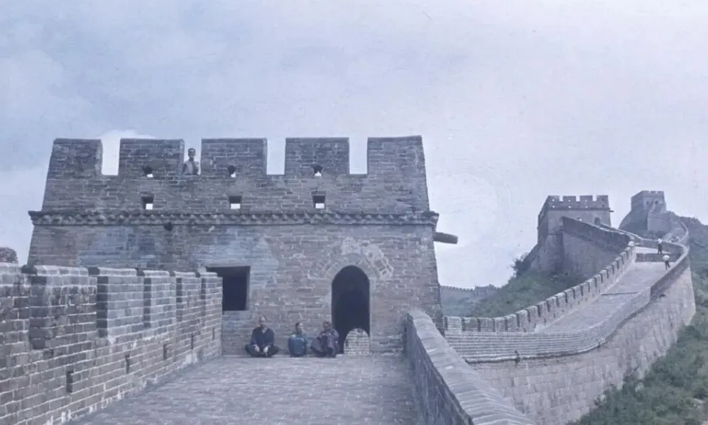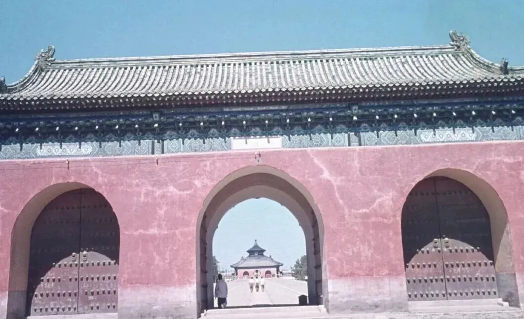 图2:长城的老照片,阴天的氛围里,长城敌楼的砖石古朴厚重,几位游客穿着深色布衣坐在敌楼门洞前休息,城墙向远处蜿蜒延伸。图3:正阳门(前门)城楼的老照片,巍峨的城楼灰墙绿瓦,飞檐翘角,下方的城墙门洞深邃,行人穿着简单的衬衫、长裤,有的挎着布包,有的结伴而行,路边还有古朴的石制香炉和低矮的围栏,绿树掩映中透着老北京韵味。图4:天坛附近的一处古建角落,弧形的灰瓦围墙旁,一座歇山顶的小型建筑矗立,墙面素净,屋檐的瓦当精致,几位行人靠墙而立,树木枝叶繁茂,阳光洒落,很静谧。图5:天坛的祈年门,朱红的城墙、拱形门洞,透过中门能看到远处的祈年殿,门洞前的行人身影单薄,红墙灰瓦在蓝天映衬下格外鲜亮,不像现在的祈年门挤满了人。