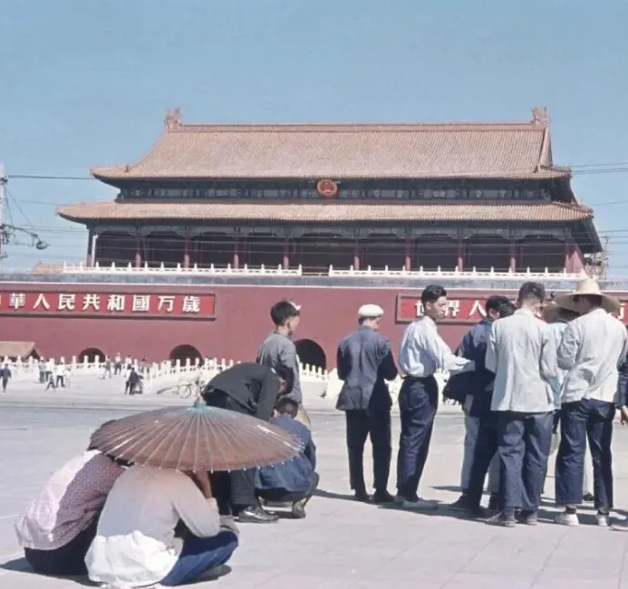 图7:天安门广场的另一视角,人们穿着白衬衫、蓝布褂,有的围站交谈,有的蹲在地上,还有人撑着油纸伞遮阳,广场开阔而宁静,红墙黄瓦的城楼在蓝天背景下格外醒目,看得出那个年代的质朴。