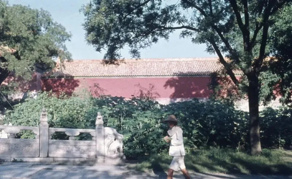 图10:故宫的红墙夹道,朱红的宫墙、灰瓦屋顶,墙下的绿植茂密繁盛,一位戴着草帽的行人穿着浅色衣裤走过石桥,石桥的石栏雕刻精致,树荫斑驳,故宫深处的清幽与闲适尽显眼底。