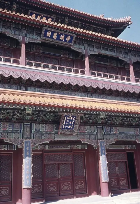 图12:这是颐和园的一处多层楼阁建筑,牌匾写着净域慧因?不知对不对,看不太清楚。典型的清代皇家楼阁,彩绘华丽,红柱、黄瓦、精致的木雕和彩绘装饰。