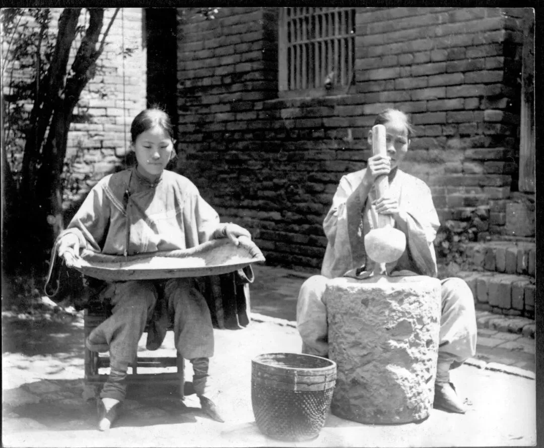 一对妇女在进行劳作,一个舂米一个筛谷,三寸金莲映入摄影者的镜头下。