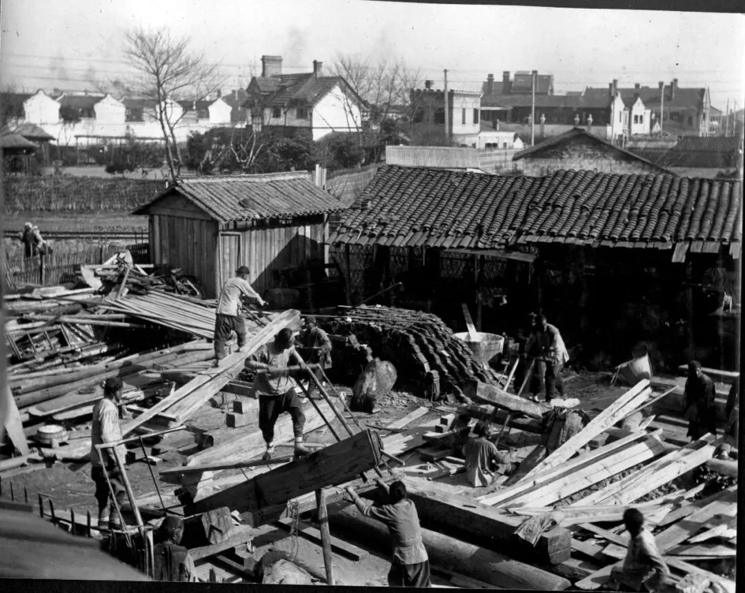 城郊的木材厂,正在锯木头的工人。