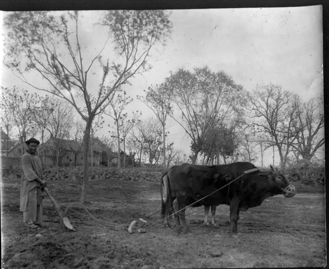一头耕牛拉着犁在犁地,犁辕都已经变为铁质的。