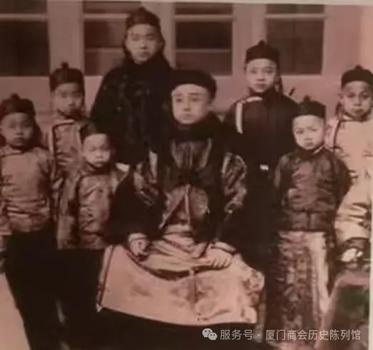 这张照片拍摄于1905年,地点在鼓浪屿鹿礁路林氏府。青年林尔嘉身着清朝官服,眼神自信笃定,坐姿端方挺拔,尽显世家的优雅、沉稳的气度。携七个儿子入镜,前排左起七子志宽、六子克恭、尔嘉、次子刚义;后排左起五子履信、长子景仁、三子鼎礼、四子崇智。