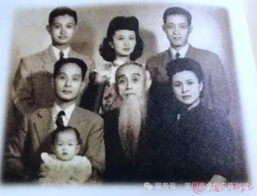 林履信(抱孙)、玉宝英夫妇及长子林楷(后排右一)夫妇、次子林楠(后排左一)与林尔嘉合影,摄于1946年