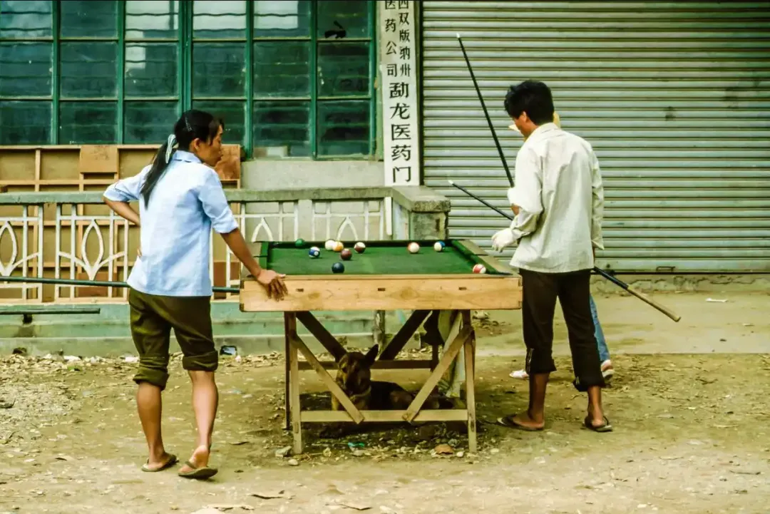1、1991年的西双版纳,由外国摄影人Alexander Dülks拍摄,在西双版纳州医药公司勐龙医药门市部的门口,地面没有硬化,一位女摊主正在看两个男子打台球,这是那个年代风靡全国城乡的游戏。