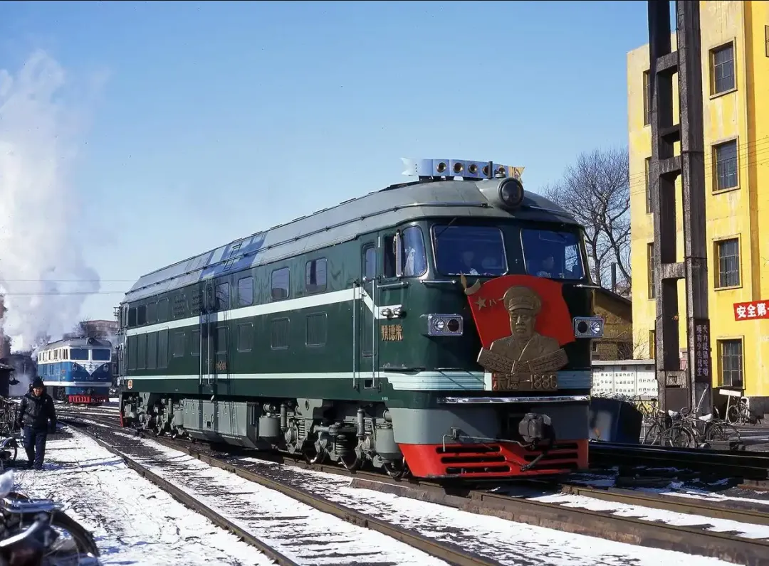 3、1995年的长春,由外国摄影人Dave Peachey拍摄,这是当年的3月17日,铁轨旁还有不少积雪,一辆绿色的火车头缓缓驶来,正面是朱德元帅的像,车身有“朱德号”的字样,想必很多长春读者应该见过。