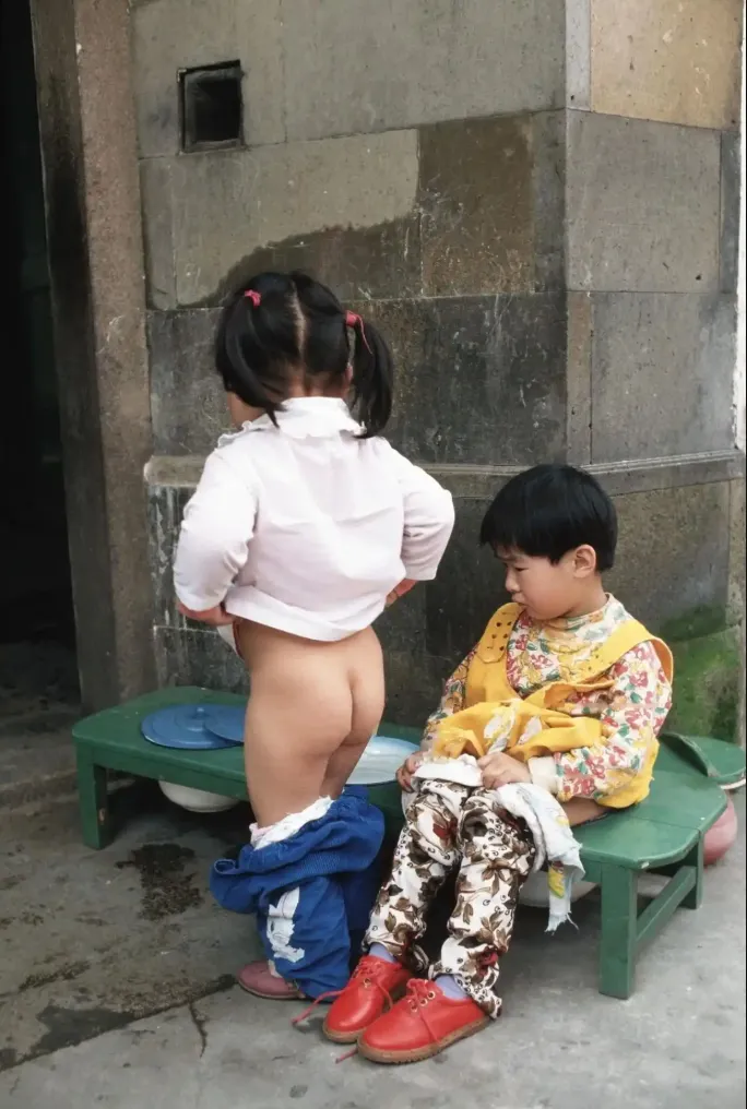 4、1994年的苏州,由外国摄影人Peter Charlesworth拍摄,在一个巷子里,门前有两个孩子,绿色的长条凳中间挖了三个孔,分别放置了便盆,中间的孩子光着屁股,旁边的小女孩安静地坐着。可能是一处幼儿园的门口。