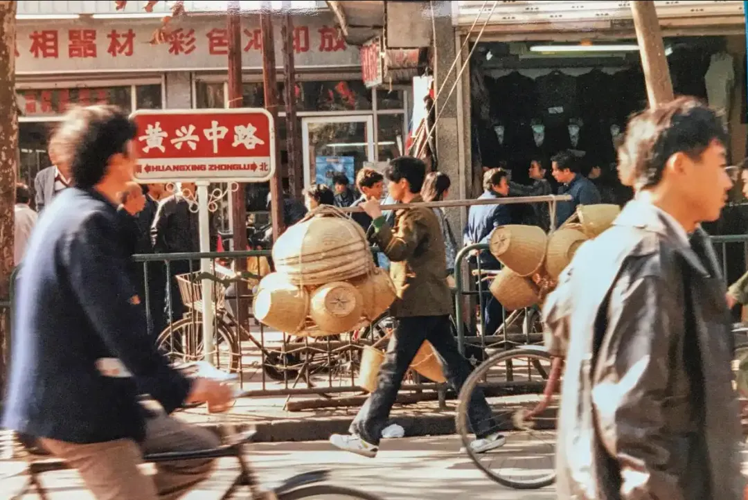 5、1990年的长沙,由外国摄影人John Clark拍摄,大街上人来人往,从路牌上的文字可以得知是黄兴中路,后方是“照相器材彩色冲印放大”的店面,路旁可以看到一位男子挑着竹器走过,那个年代的人间烟火气极为浓厚。
