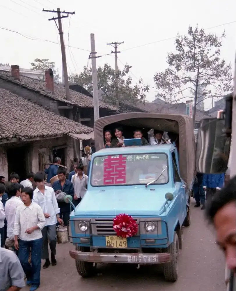 6、1991年的四川某地,由外国摄影人Bob Worobec拍摄,在一条街道上,旁边的房屋还有一点传统的模样,一辆车牌号“四川44-05149”牌号的卡车,车窗上贴着喜字,车头挂着大红花,后方的车斗挤满了人,这应该是一支迎亲队伍。