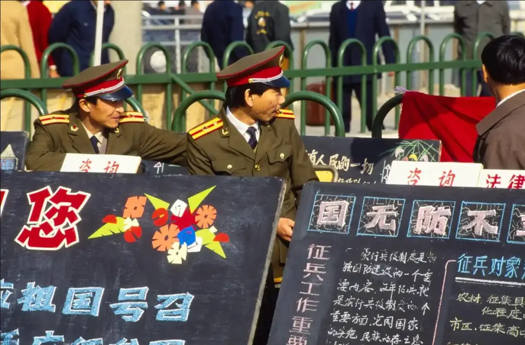 7、1991年的上海,由外国摄影人tula roy拍摄,在广场上,正举行着黄浦区的征兵宣传活动,当地武装部的人员坐在咨询台前,黑板上是粉笔绘写的口号和相关知识。
