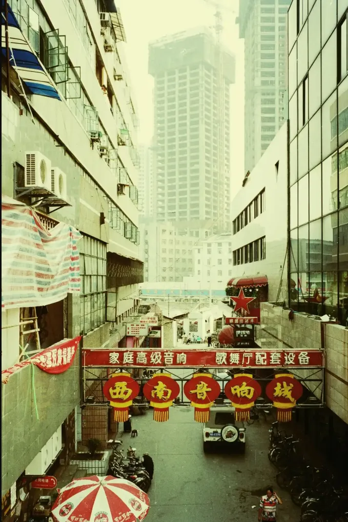 8、1996年的成都,由外国摄影人michel peterlin拍摄,在当时的西南音响城,主要销售家庭高级音响和歌舞厅配套设备,那时国人对高级音响很是追捧,各地的歌舞厅层出不穷,前方的招牌有一颗红星,这是“根据地酒家”的标志。