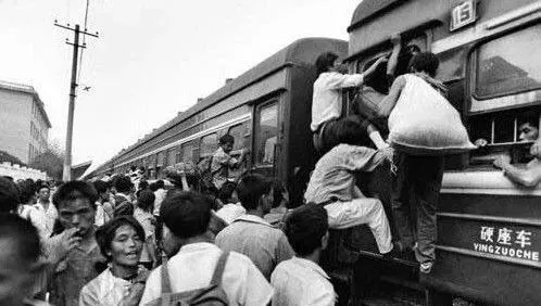 80年代,人们登火车的情景。