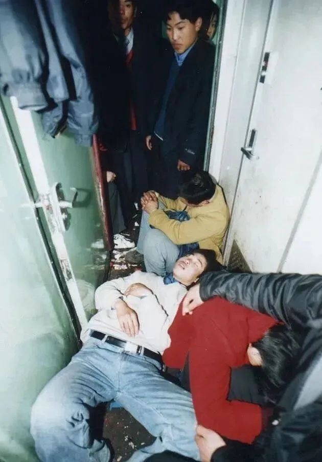 2001年,春运期间拥挤的列车上,乘客睡在过道的地上。