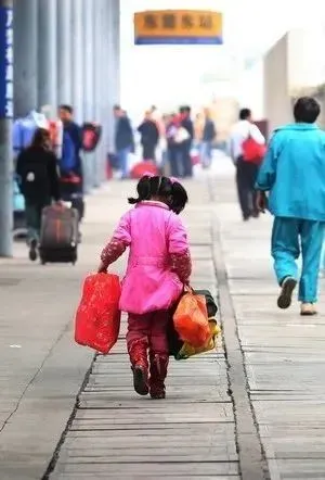 2011年1月8日,一名外来务工人员挑着行李、背着孩子在杭州火车站赶车。破旧的麻袋、背上的孩子,赶路的艰辛,一脸的匆忙。