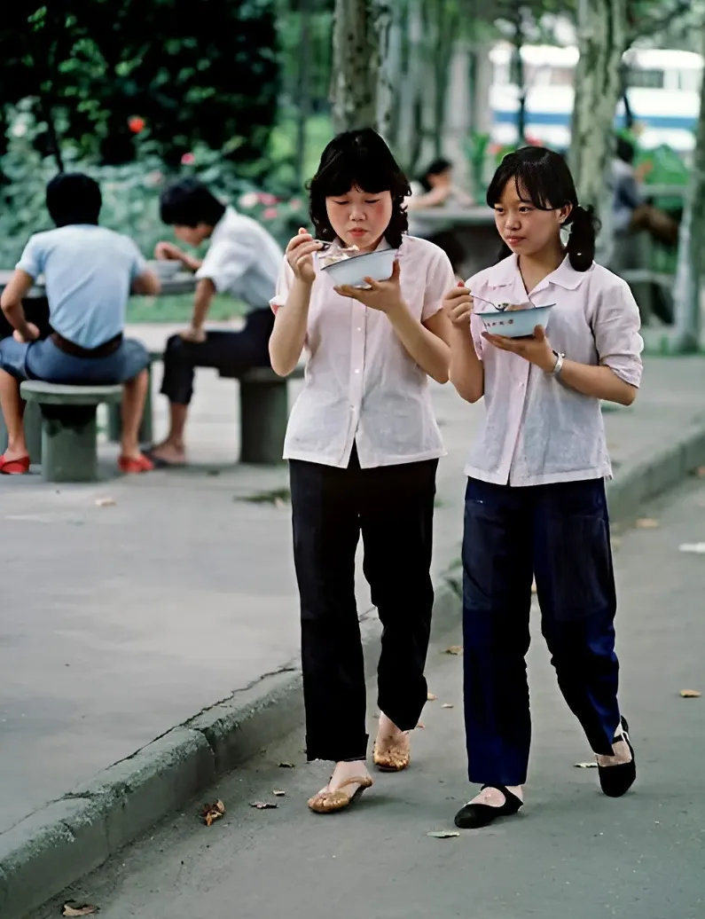 这张照片里,两个年轻的姑娘正端着碗在边走边吃,看她们的穿着打扮,应该是工厂里的女工,