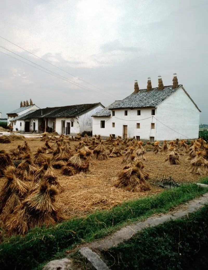 这张照片挺有意思的,一排白墙黑瓦的房子,屋顶上却矗立着好几个烟囱,