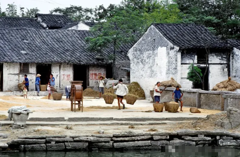 村民们正忙着收稻子,有的在扫,有的在装筐,河边还有个大哥跳进水里在洗脚,估计是干活热了,