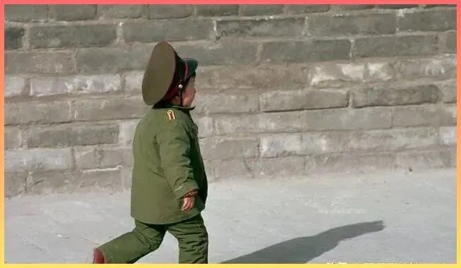 这小家.伙,穿着一身不合身的大人军装,戴着大盖帽.,走起路来像模像.样的。那时候的小男.孩,谁没有一个当兵的梦呢,这身装扮,在当时绝对是孩子王级.别.的待遇。