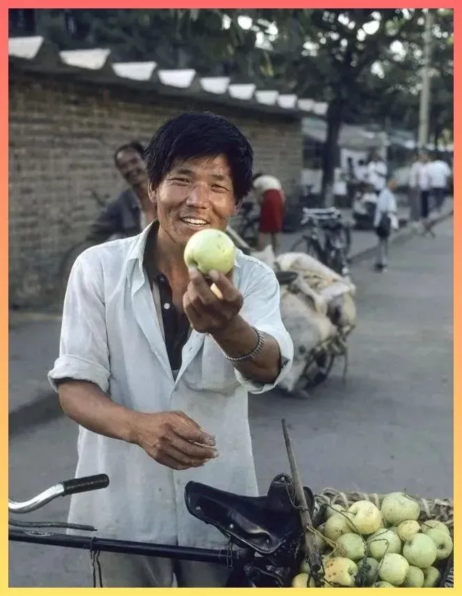 卖苹.果的.大哥,.笑得多开心!那时候的水果没有打蜡,没有催熟.,咬.一口是真甜,.带着泥土的芬芳。你看他手里那个苹果,虽然长得不.好看,但.那是实实在在的.绿色食品。