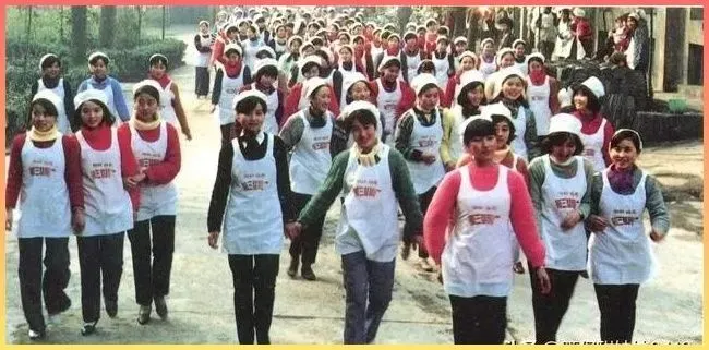 最后这.张,是一群穿着围裙的妇.女走在路上,可能是去参加集体劳动或者是食堂的工作人员.。大家脸.上洋溢着自信的笑.容,那种集体主义的.归属感,是那个时代特有的印记。