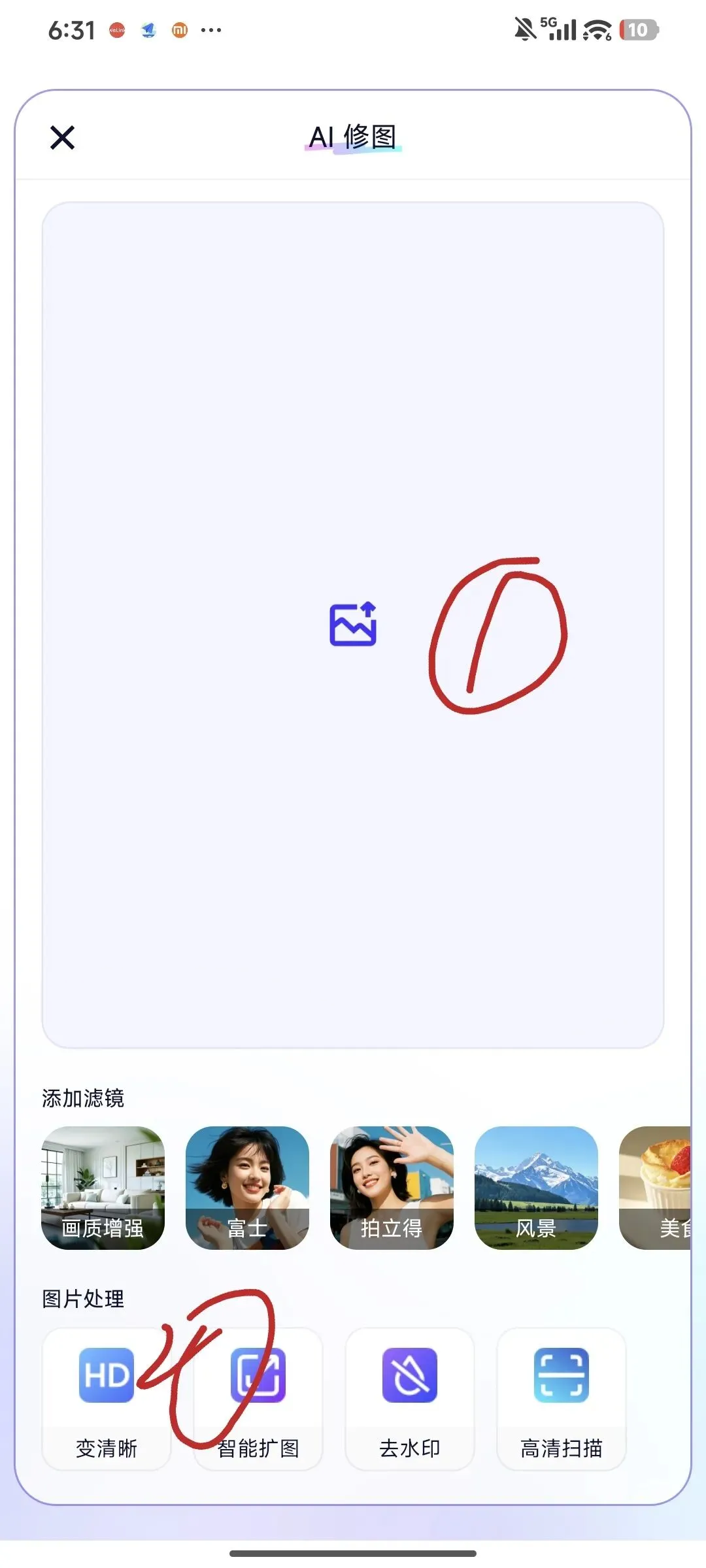 3. 选择功能:点击中间图片上传按钮,然后在图片处理功能列表里找“变清晰”选项,点击进入。