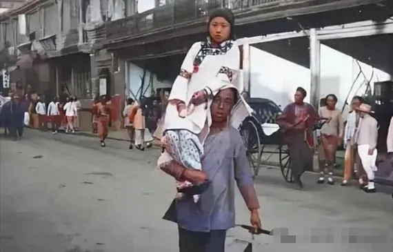 你看这张照片,是一个男人是把一个女人扛在肩膀上走路的。这种出行方式在当时是很常见的,特别是对于一些青楼女子来说,