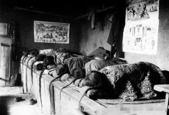 你看这张照片,是一群人挤在一个大炕上睡觉的。那时候的穷人是没有自己的床的,一家人是挤在一个炕上的,