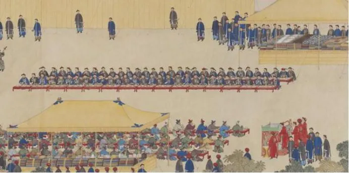 相传,每年新年,皇帝都会赐宴百官,而王公大臣们,均采用席地而坐的方式,围绕着皇帝,坐在统一制式的朱漆壸门炕桌前,一同就餐,这也可能是最早的“年饭”。