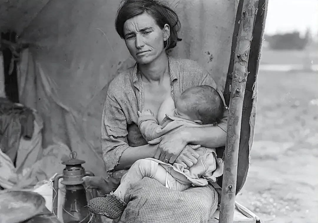 这是美国大萧条时期最著名的一张照片,拍摄于1936年的加利福尼亚州尼波莫,照片里的女人坐在简陋的帐篷中,怀里抱着嗷嗷待哺的婴儿,脸上写满了愁苦和绝望。
